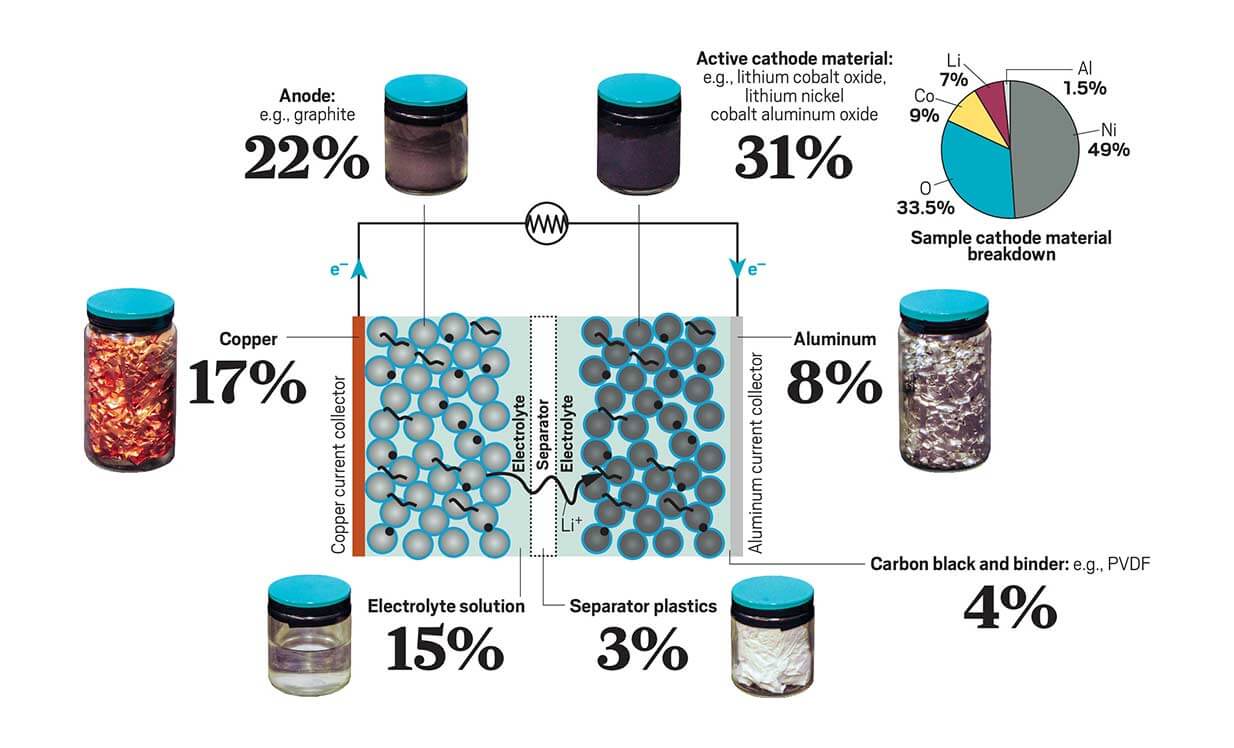 Recycled materials from lithium-ion batteries can be used to reproduce and manufacture new batteries, thereby reducing production costs. Lithium-ion batteries contain a large number of valuable metals. Among them: anode materials accounted for: 32%, anode materials accounted for: 22%, copper accounted for: 18%, aluminium accounted for 8%, plastic diaphragm accounted for 4% and so on. (The above is only one of the lithium-ion composition analysis, the specific proportion